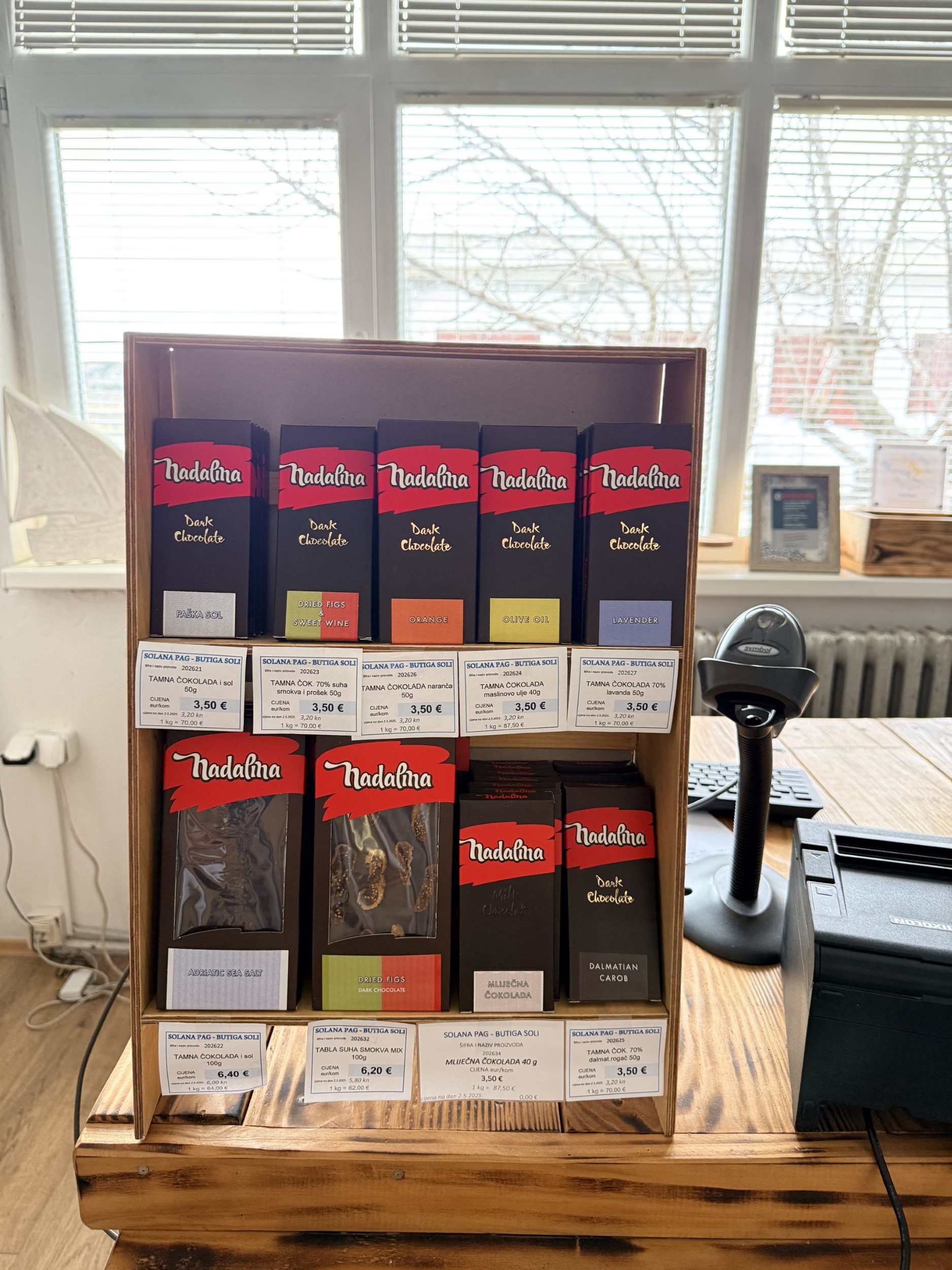 Butiga Soli nudi sve čari paške soli, od sitne i krupne soli do najpoznatijeg solnog cvijeta, a za sladokusce imamo čokolade s raznim okusima: sočna naranča, blago maslinovo ulje, mirisna lavanda i čuvena čokolada sa cvijetom soli, savršen spoj slatkog i slanog.
